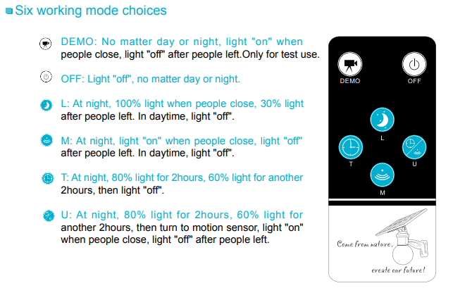 •Lighting time after fully charging the battery: for 4-5 rainy days.