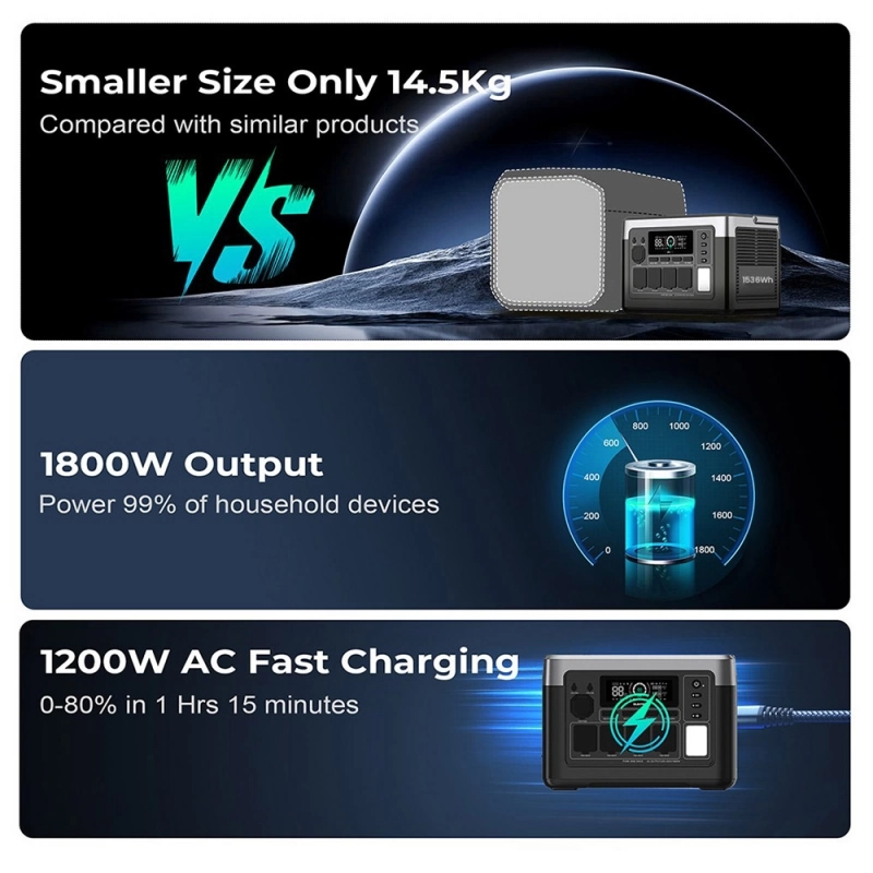 A smart-looking functional power station that can keep your home up and running in a power outage. [Perfect for 99% of home devices] The OUKITEL Power Station P1500E has an impressive 1536 Wh capacity and a powerful 1800 watt inverter that supports 99% of devices, including smartphones, speakers, fans, laptops, tablets, projectors and TVs. It is perfect for camping, motorhome trips and other family outings. The pure sine wave inverter delivers a constant voltage and protects devices from damage.